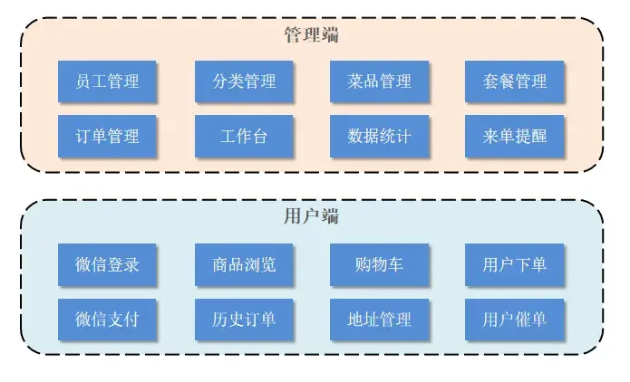 员工登录/退出 , 员工信息管理 , 分类管理 , 菜品管理 , 套餐管理 , 菜品口味管理 , 订单管理 ,数据统计,来单提醒