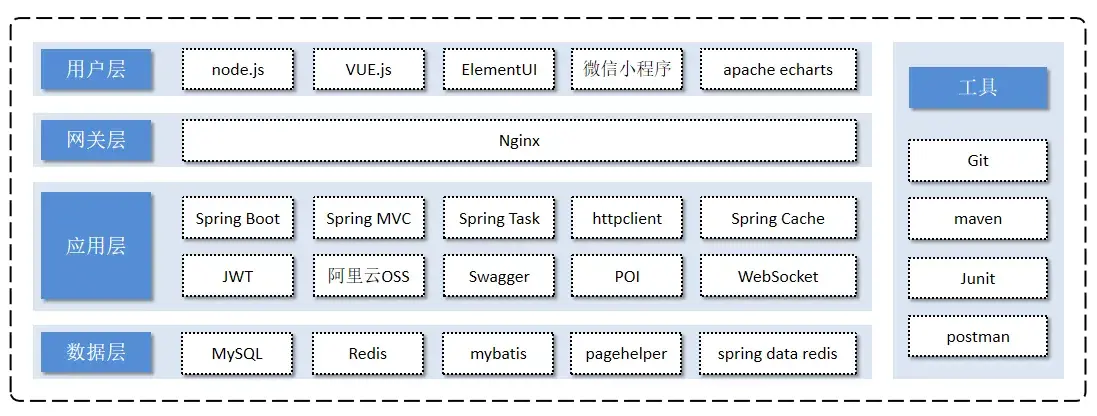 关于本项目的技术选型, 我们将会从 用户层、网关层、应用层、数据层 这几个方面进行介绍,主要用于展示项目中使用到的技术框架和中间件等。